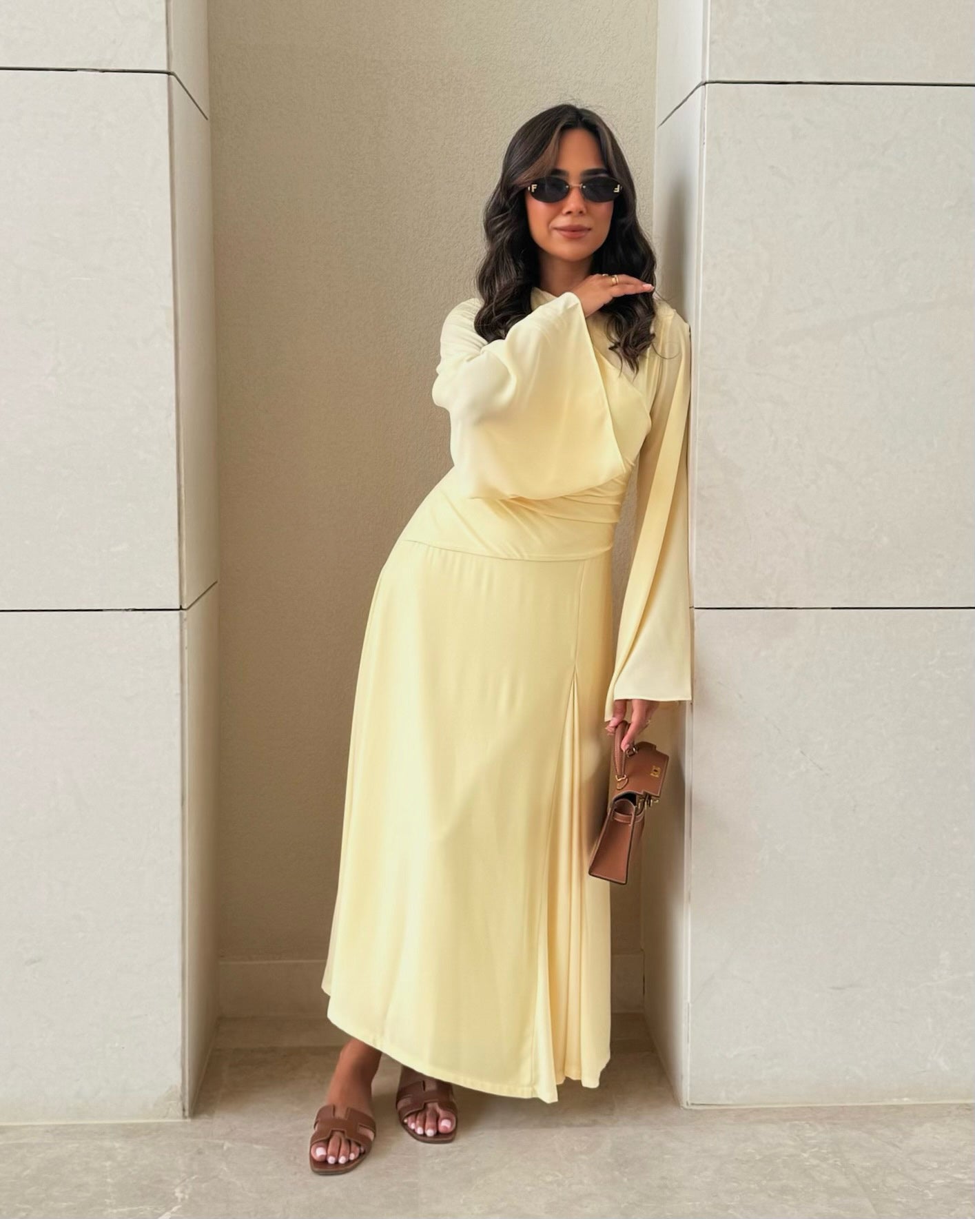 Derived from the greek word for "starfish" this stunning yellow crepe dress is the epitome of summer elegance, a beautifully draped bodice complimenting the waist with airy, wide sleeves. The flare gored skirt adds a touch of movement.