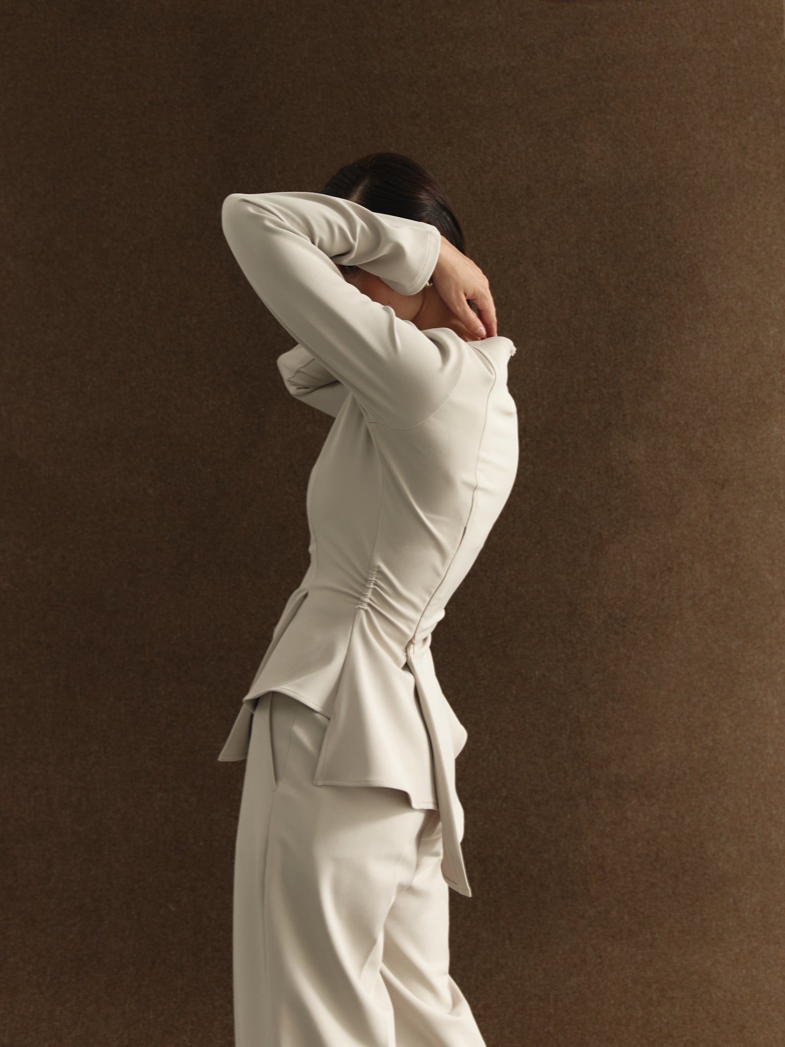 The Ghaim set is crafted from Japanese crepe in a soft oyster tone. The top is tailored with an asymmetrical silhouette that softly contours the waist before falling into a fluid peplum line. It is paired with straight-cut trousers that create a clean, balanced silhouette.