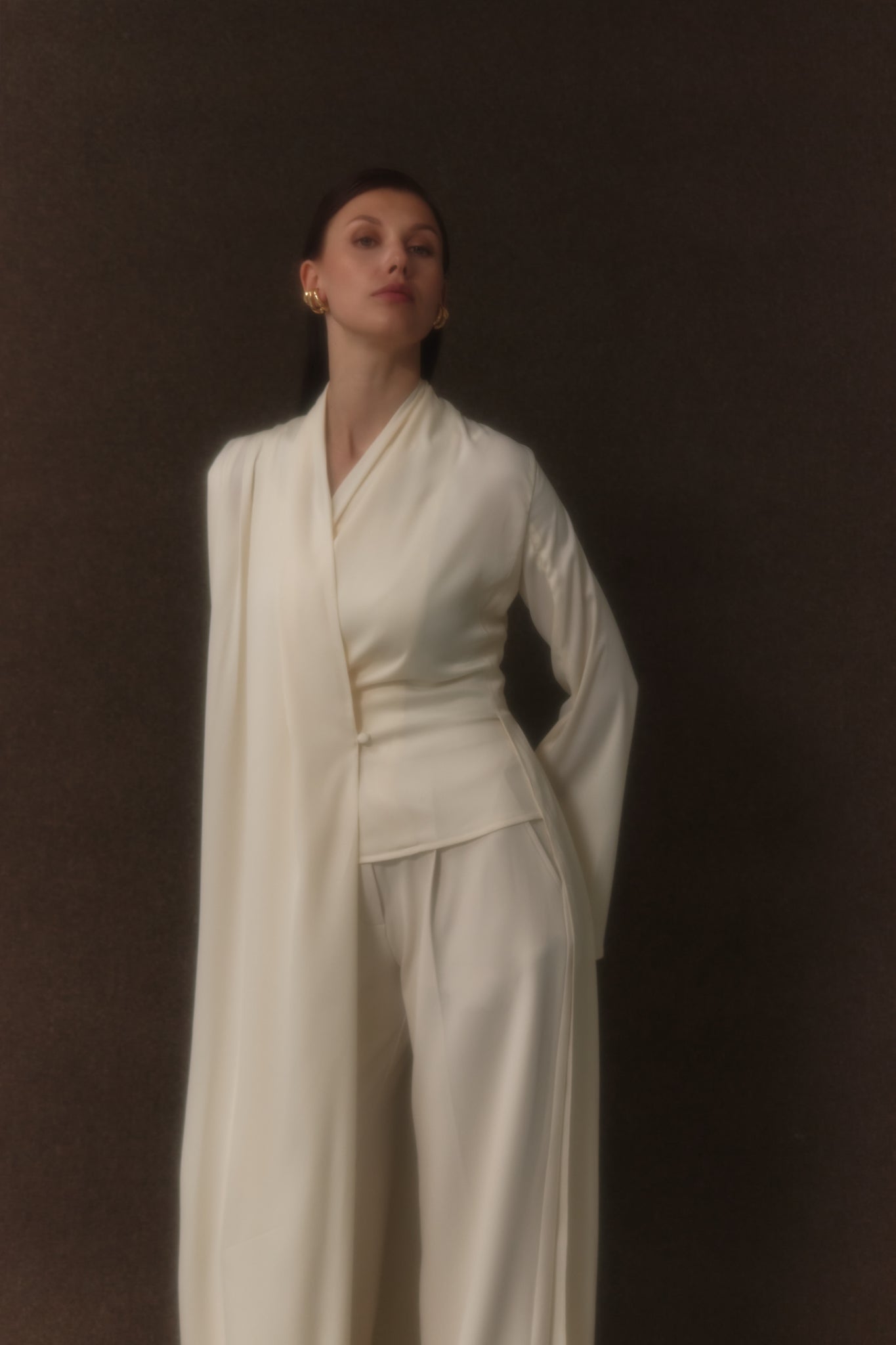 The Naseem top is crafted from soft sheen crepe in a soft crème tone. Designed with an asymmetrical shawl-style jacket, it is detailed with pleated shoulders that add gentle structure while maintaining an elegant, fluid silhouette.