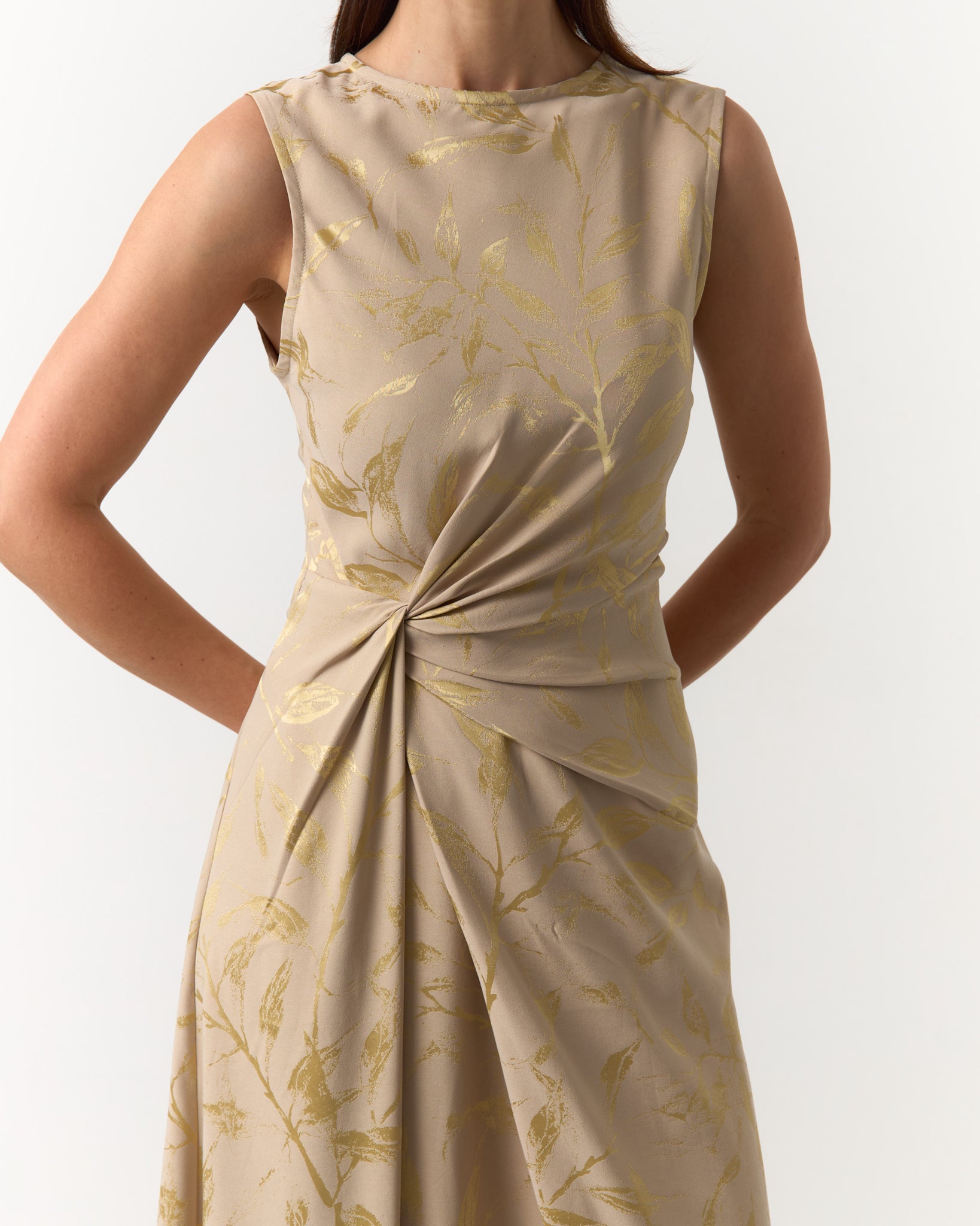 The waist is softly defined with a twist-draped detail that contours without structure, keeping the silhouette clean and feminine.