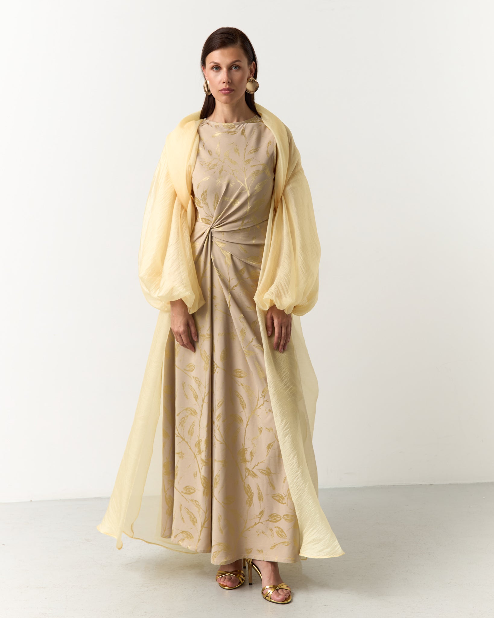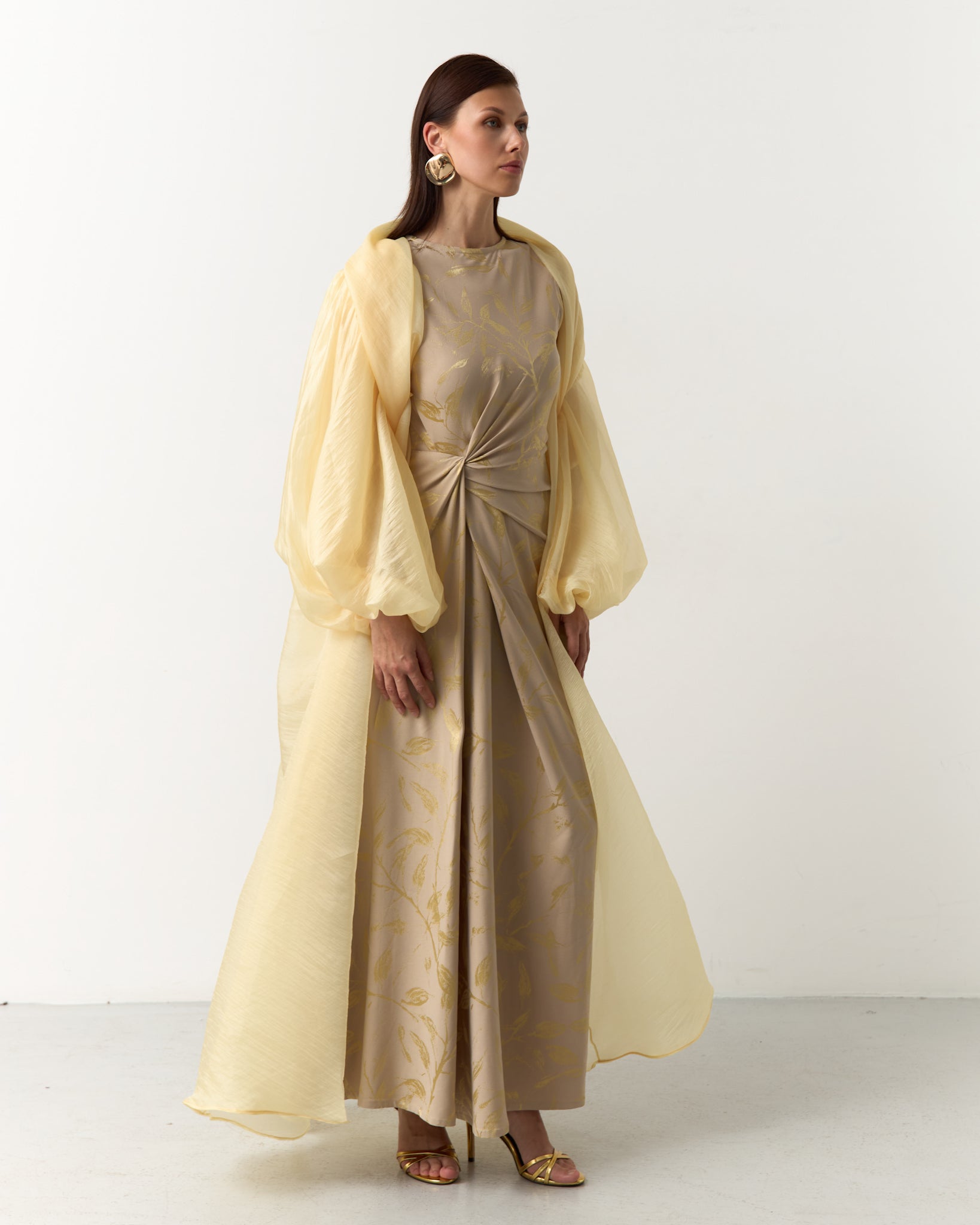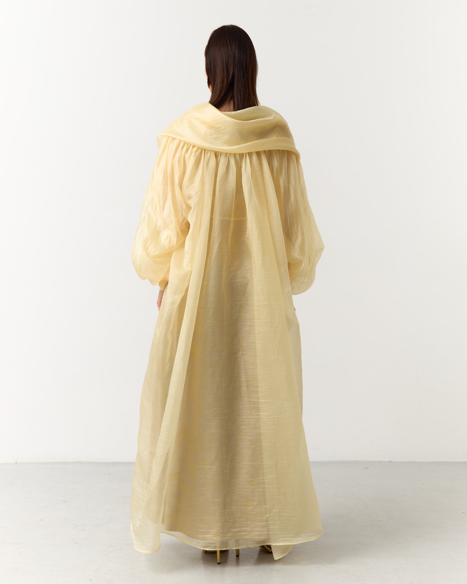 The dress is paired with a lightweight yellow maxi jacket, designed with extra-large bishop sleeves that bring fluid volume and a graceful 50s-inspired mood.